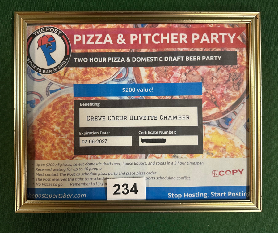 Items can be picked up immediately following the close of the Auction at the check-in table. Those, not present can pick up items at the Chamber during normal business hours. Items can be shipped for an additional charge.