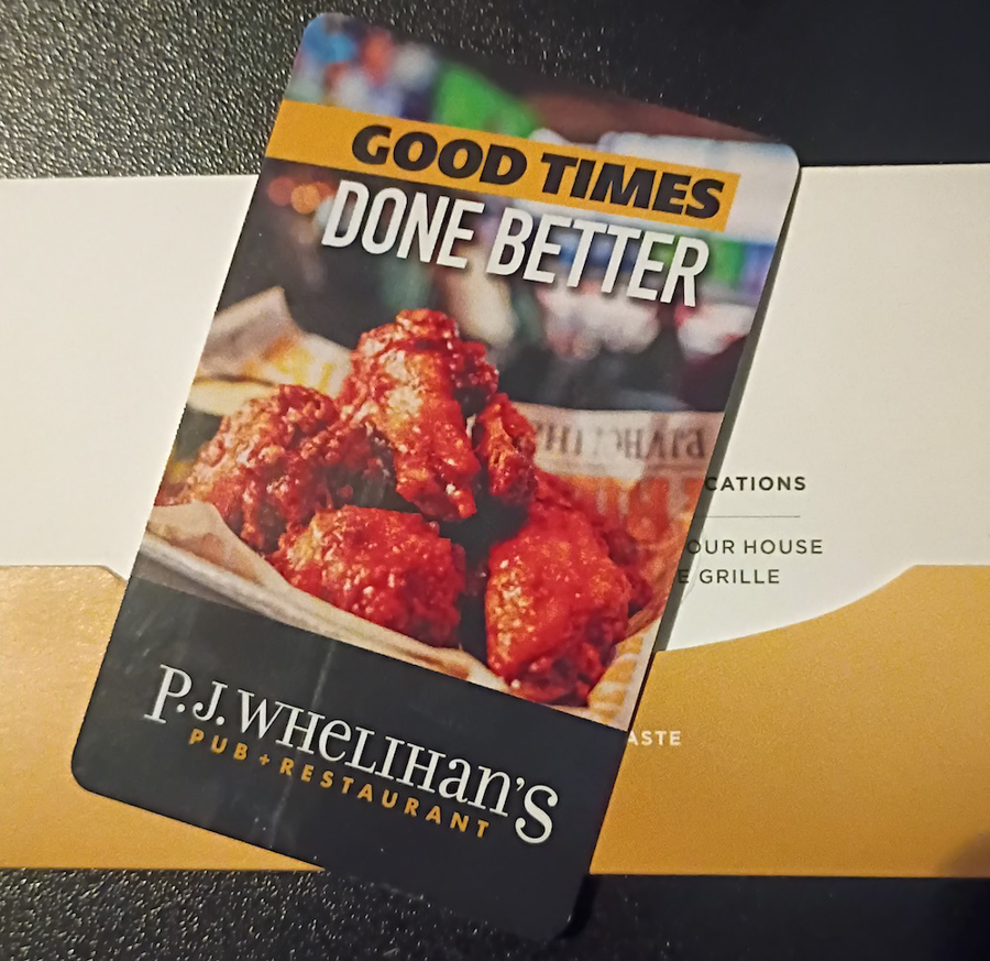 Please note that this cannot be used for alcohol. Enjoy good food and drinks while watching the game or just hanging out. Wings, burgers, and more are available to eat with a selection of beers, wines, etc.