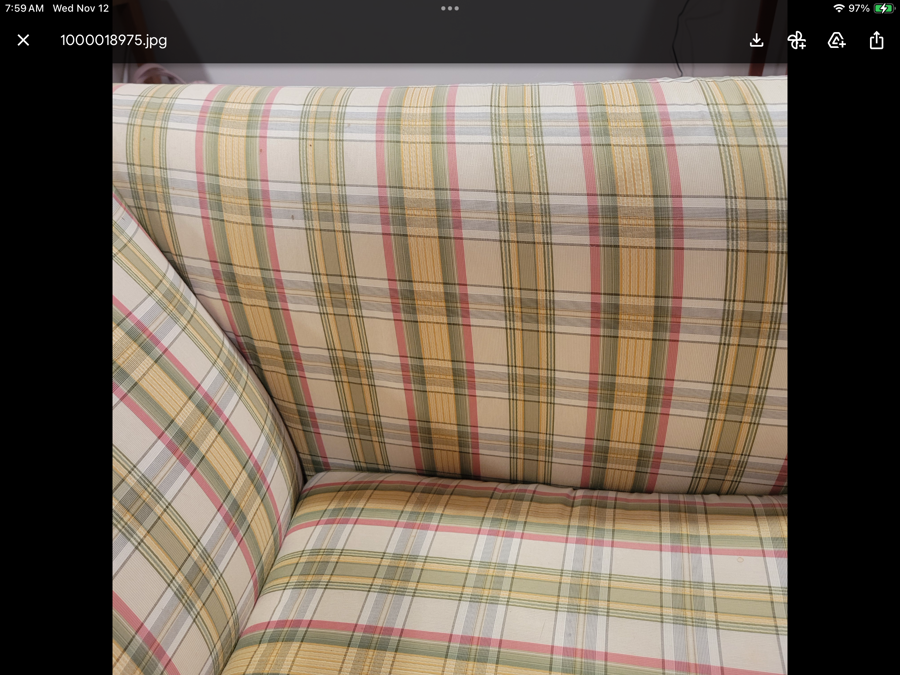 Pretty plaid love seat - gently used- Small mark at back left