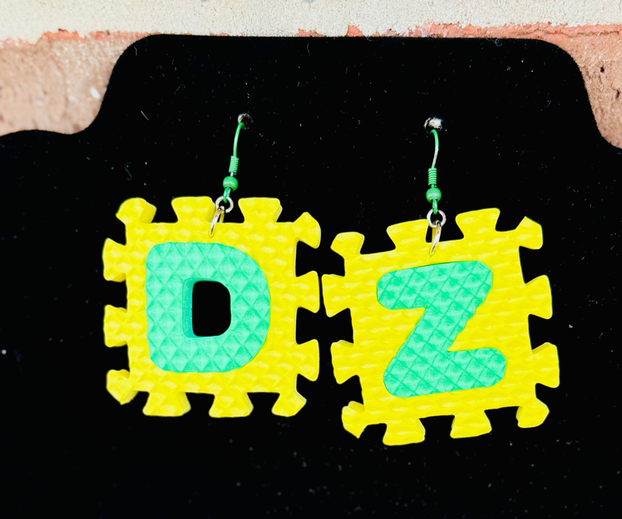 Fun handmade earrings made from alphabet playmats! Made by Ollie Moder, ECC Assistane & ED Guide