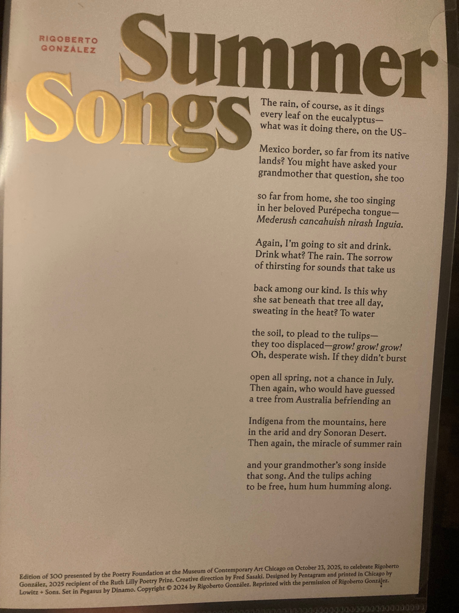 This Poetry Foundation package features a limited edition print of Rigoberto González's "Summer Songs," produced in honor of the author's acceptance of the 2025 Ruth Lilly Poetry Prize. You also get a Poetry Foundation tote bag, the October print edition of Poetry, and a certificate for a one-year subscription to the magazine.