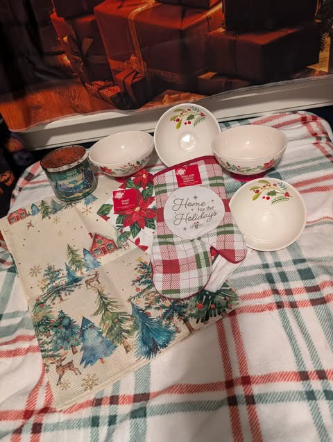 ❤️🌺 Poinsettia Passion 🎄✨ Bring the beauty and warmth of the holiday season into your home with Poinsettia Passion, a festive collection designed to brighten your table, your kitchen, and your winter evenings. This elegant holiday bundle features timeless poinsettia-themed pieces paired with a cozy seasonal fragrance—perfect for holiday hosting, gifting, or treating yourself to a touch of Christmas charm. Includes: Set of 4 Holiday Bowls – Beautifully crafted bowls adorned with a classic poinsettia pattern, perfect for serving holiday treats or adding a festive touch to your table. Poinsettia Holiday Hand Towel – A soft, decorative towel that brings a cheerful pop of seasonal color to any kitchen or guest bath. Home for the Holidays Oven Mit - the perfect holiday baking accessory Holiday Table Runner – A coordinating runner that sets the stage for warm gatherings and festive dinners. Bath & Body Works 3-Wick Candle (Fresh Balsam) – Fill your home with the crisp, comforting scent of evergreens and the magic of the season. With its blend of elegance, warmth, and holiday spirit, Poinsettia Passion is sure to make any space feel merry, bright, and beautifully dressed for Christmas. Add a flourish of festive charm to your home—place your bid today! 🌟