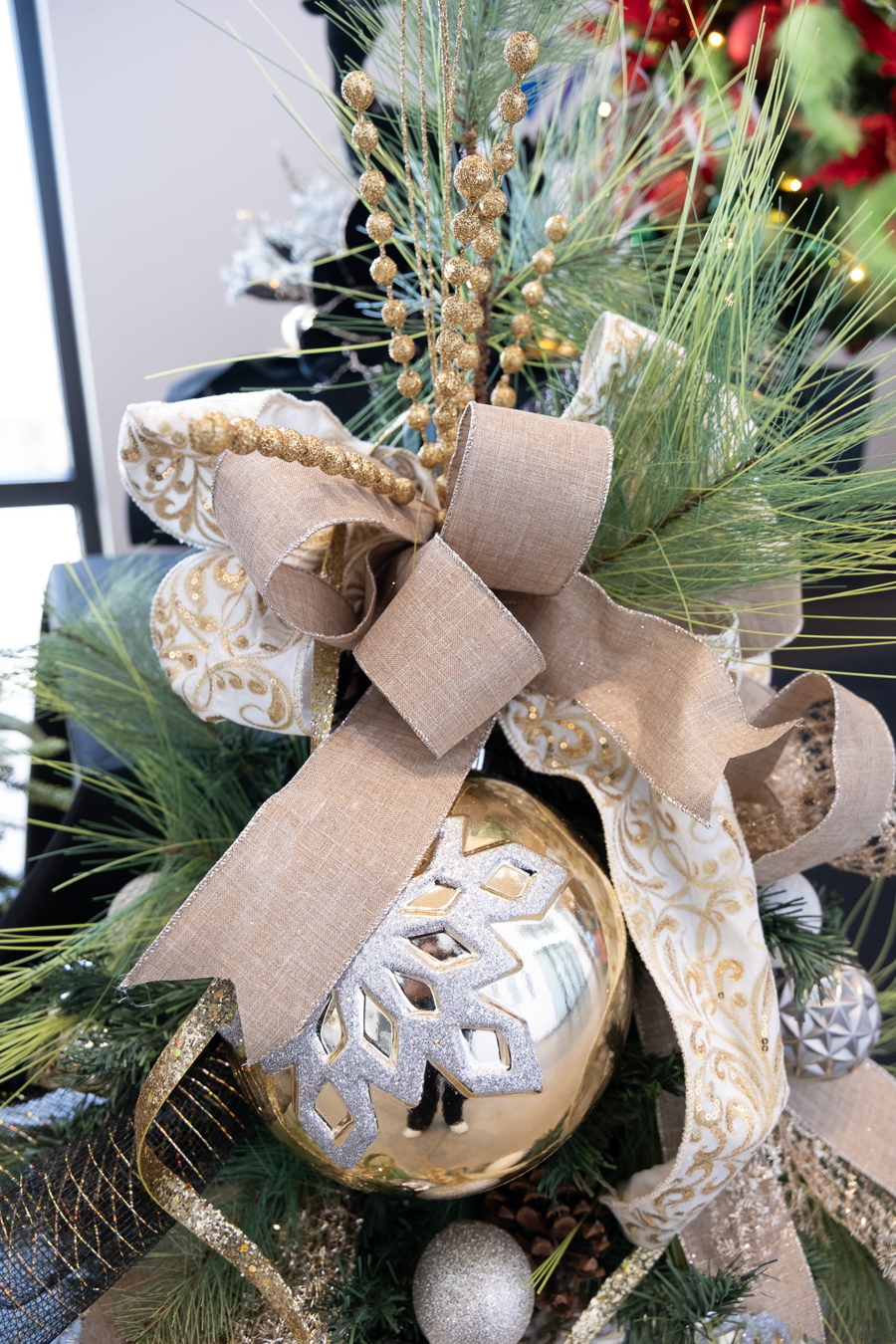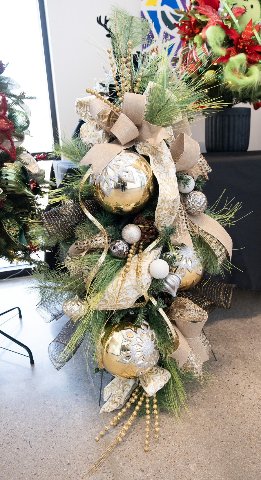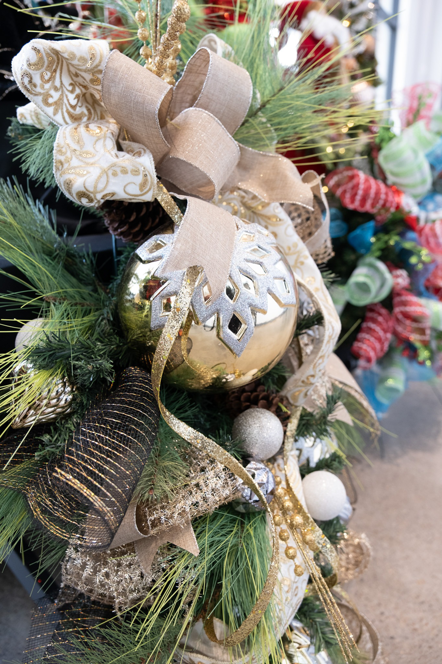 This luxurious gold and neutral teardrop spray will add elegance to your door or wall. The oversized polished bulbs featuring silver snowflakes sit atop lush evergreen foliage and long pine needles that give it a soft, organic shape. Smaller bulbs with glittery and textured finishes are carefully placed around gold beads and ribbons in gold, burlap and creamy patterns. Pinecones are tucked in to enhance the natural, wintery look. *Measures 24" wide x 48" tall