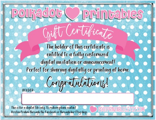 1 Gift Certificate for a Fully customized digital invitation or announcement.