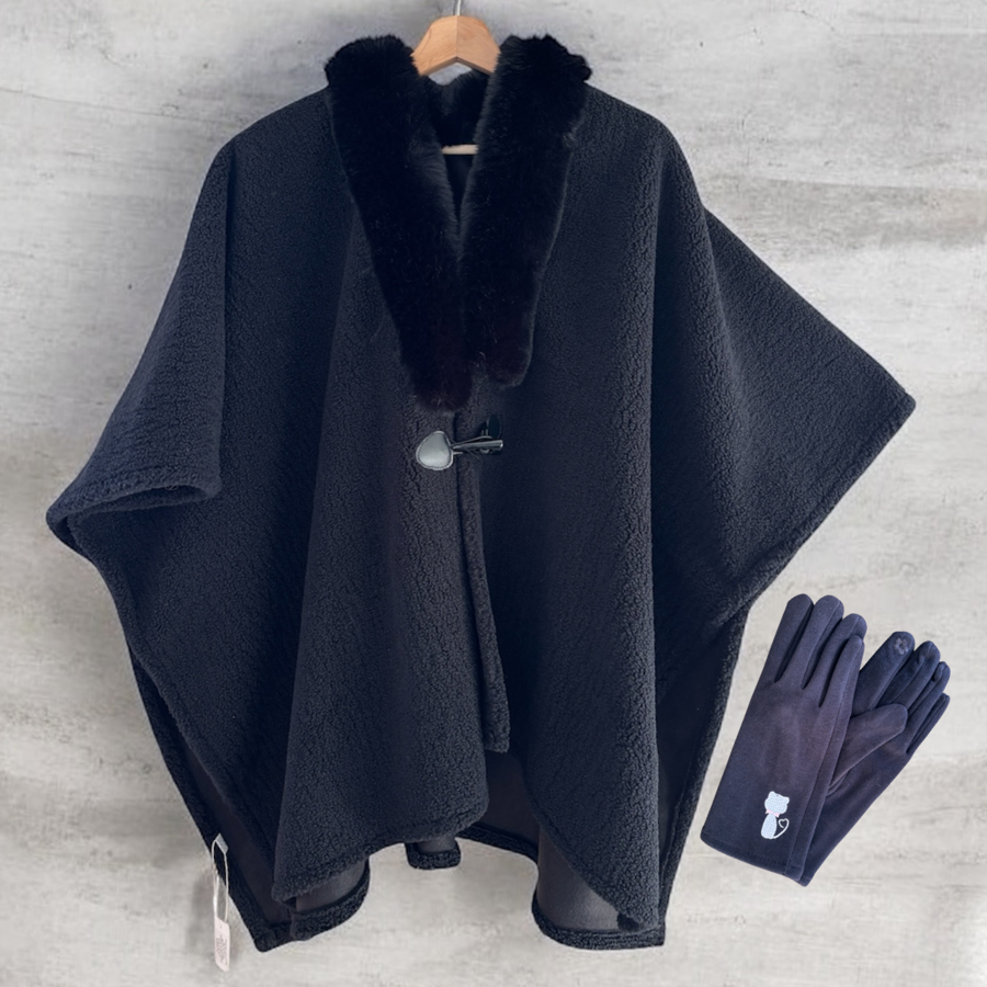 Stay warm with this teddy fleece poncho, finished with plush faux fur trim for a touch of elegance. Complete your look with black gloves, featuring an embroidered cat detail that adds a playful accent. Perfect for layering in cooler weather, this set keeps you cozy and stylish.