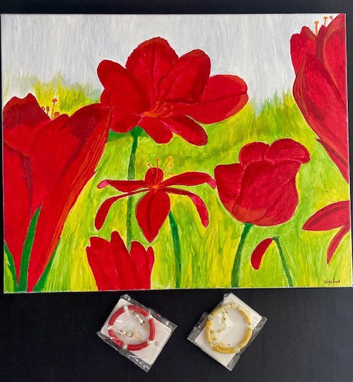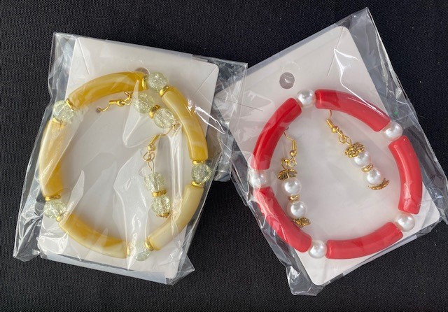 In addition, the package comes with 2 bracelet and earring sets - 1 red/white and 1 gold/cream swirl design. These lovely items were donated by Creations by Elizabeth Denoncourt.
