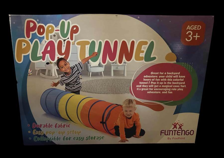 Colorful Pop-Up Tunnel Toy for toddlers and even Pets! This tunnel is collapsible for easy storage and pops open for easy set up! It measures about 18 1/2 inches by 6 Foot and can be used indoors as well as outdoors. You children will love having this tunnel to play and hide in!