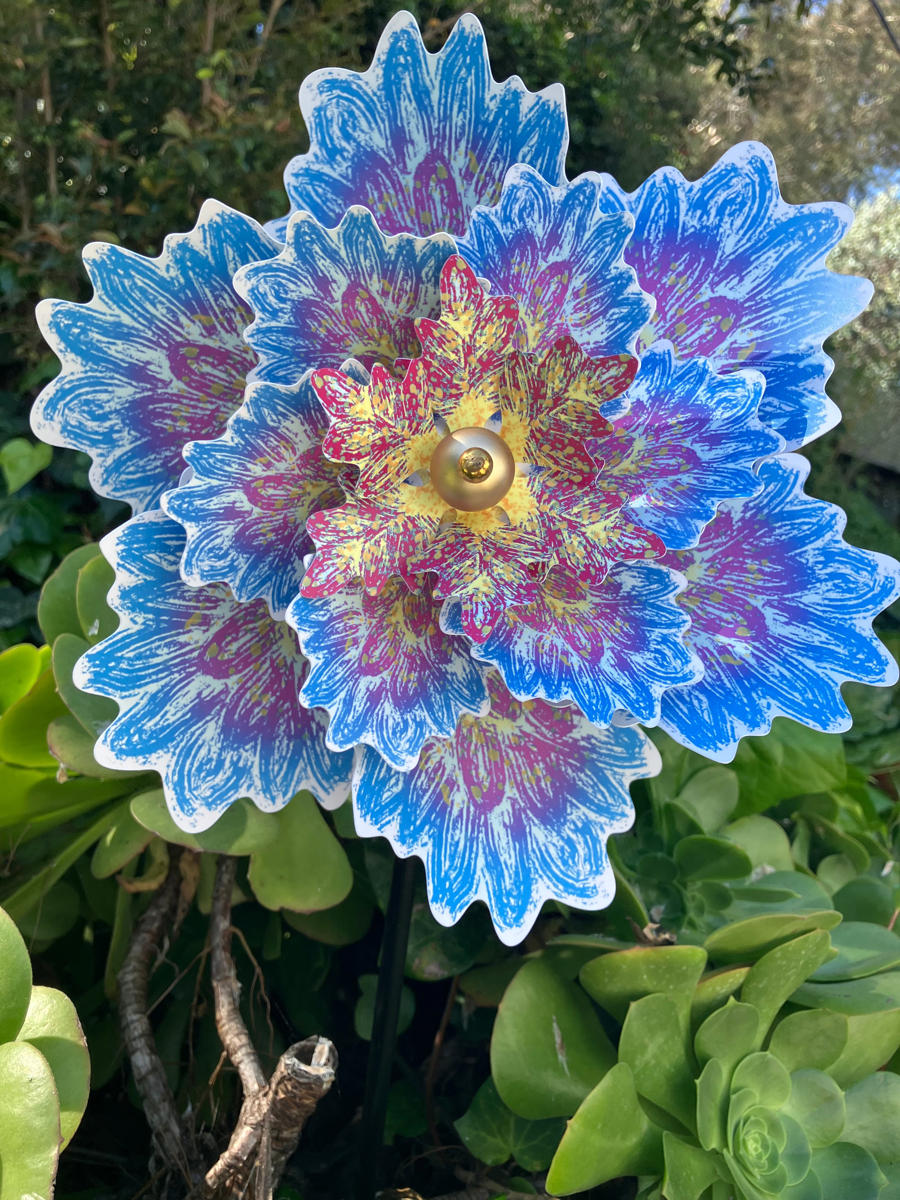 Created and constructed by artist Jerolyn Crute who founded Paper Arboretum. Paper Arboretum puts a literal spin on garden decor! Jerolyn creates uniquely designed; hand-assembled waterproof pinwheels inspired by nature. A simple gust of wind propels butterfly wings into flight, flower petals into bloom, and bird feathers go soaring as pinwheels go whirling!