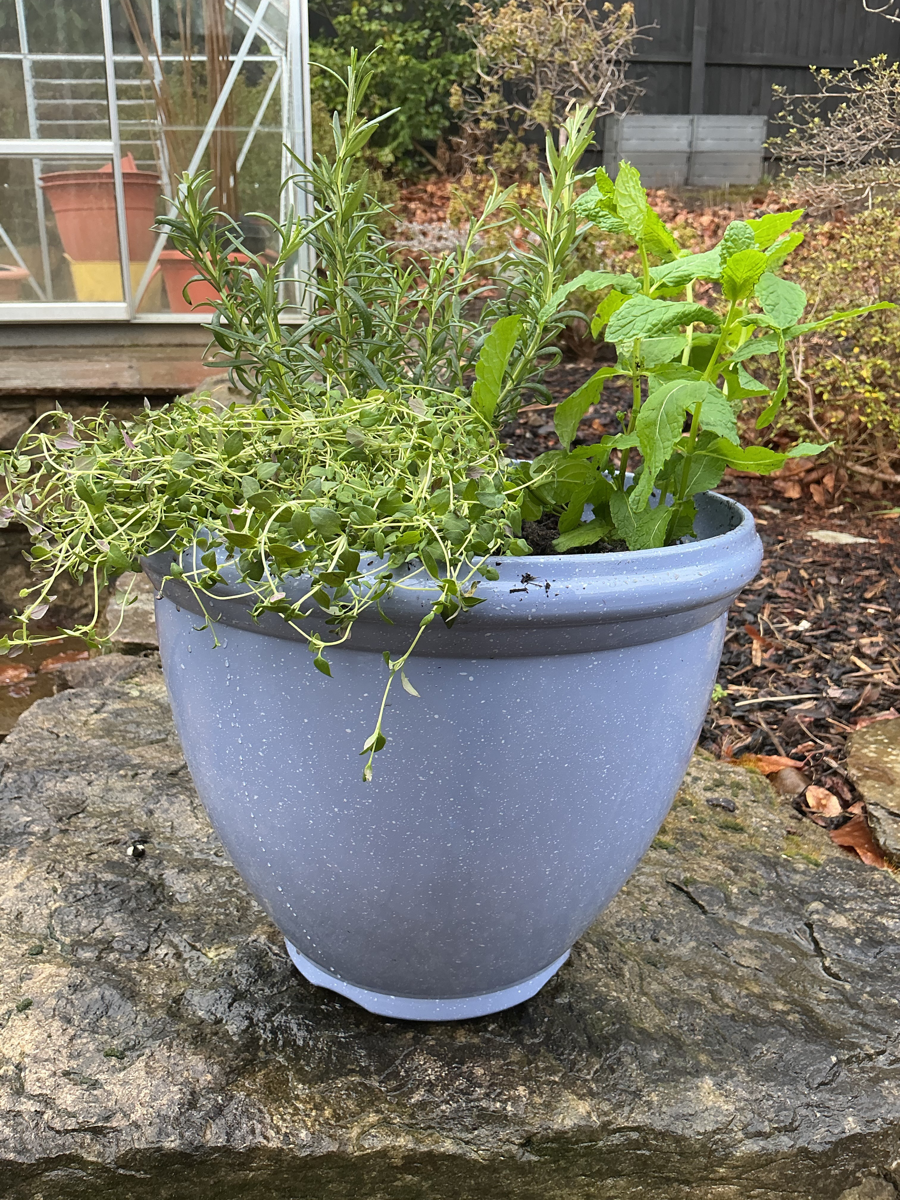 A lovely, useful addition to any patio or kitchen garden. Frost proof soft lilac coloured pot planted up with oregano, rosemary and mint. Keeps those essential herbs handy for summer barbecues and cocktails!