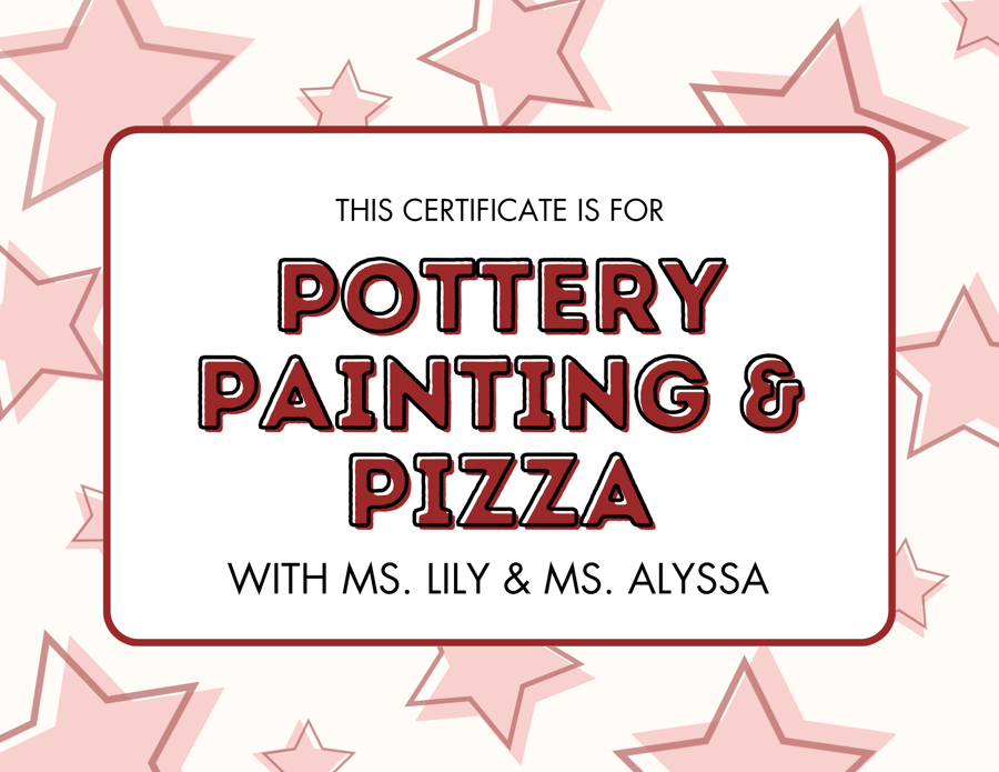 Join us for a fun-filled time of Pottery Painting and Pizza with Ms. Lily and Ms. Alyssa! This exciting event offers a perfect blend of creativity and delicious food. Unleash your artistic side as you paint your own pottery pieces guided by the talented Ms. Lily and Ms. Alyssa. After expressing your creativity, enjoy a delicious pizza feast to satisfy your taste buds. Whether you're a seasoned artist or just looking to have some fun, this event promises to be a memorable experience for everyone. Don’t miss out on the chance to create something beautiful while enjoying great company and tasty pizza!