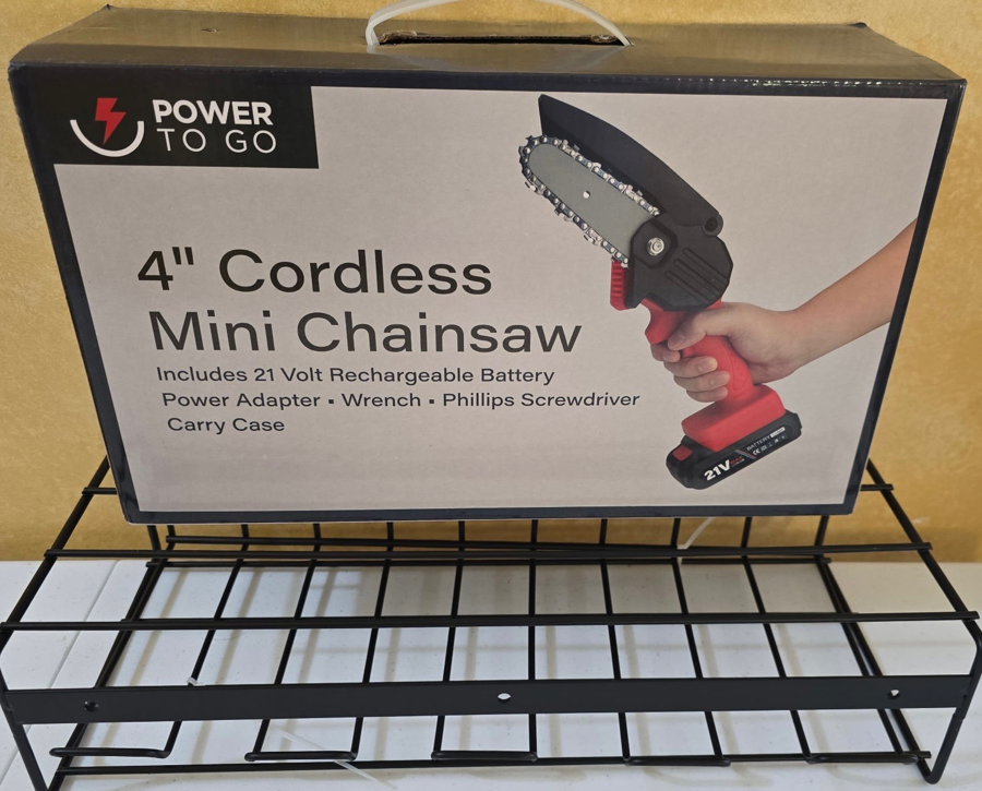 The Power to Go Mini Chainsaw, the ultimate solution for all your cutting needs! This compact and powerful mini chainsaw comes equipped with a 21-volt rechargeable battery that ensures you have the power you need without the hassle of cords. The included power adapter makes recharging a breeze, allowing you to get back to work quickly. For your convenience, it has a carrying case ensures that your mini chainsaw is always organized and easy to transport. A tool rack is also included, making it simple to store your tools neatly. Whether you're trimming branches, cutting firewood, or tackling DIY projects, the Power to Go Mini Chainsaw is your go-to tool for efficiency and portability. Don't miss out on this essential addition to your toolkit!