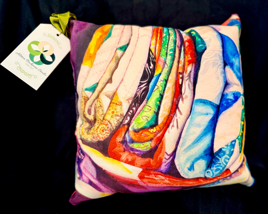 Prayer Quilt original painting, easily made the leap onto soft velvet, offering art to adorn a cozy chair.