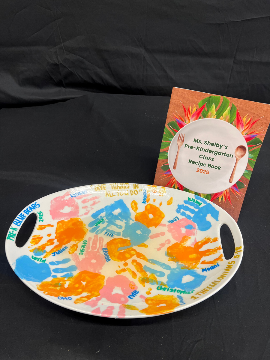 "This year’s Blue Bear Heart Gift is a priceless keepsake made with love by our class. It includes a beautiful handmade platter, designed with each child’s unique touch, and our very own Blue Bears Class Cookbook, filled with family-favorite recipes from our students. This one-of-a-kind set captures the heart of our classroom and the spirit of our children. It’s a meaningful piece of Blue Bear history—perfect for your home, and cherished for years to come." Items: Handmade Platter and Class Cookbook