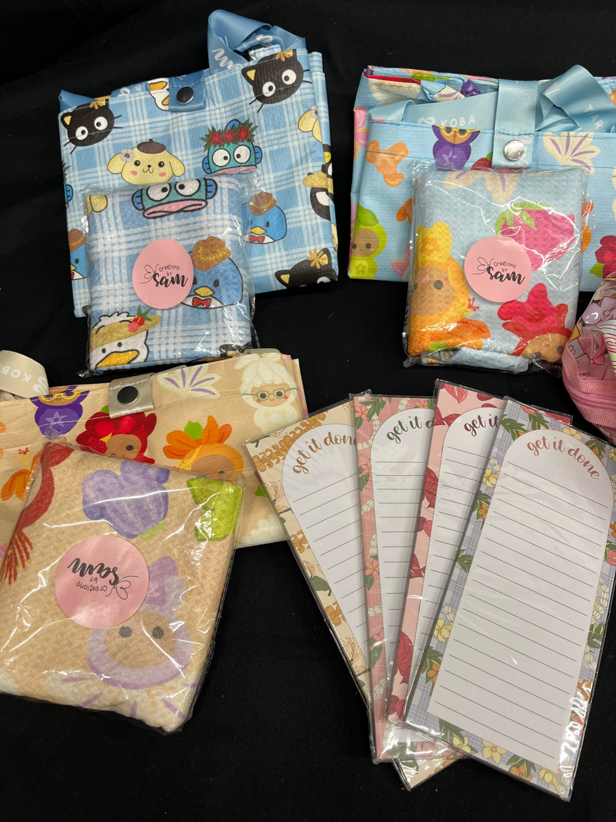 Featuring Two Local Hawaiʻi Makers. Celebrate creativity, sustainability, and island magic with this fun and functional bundle from two talented local Hawaiʻi vendors who blend beloved Disney and character-inspired designs with a unique Hawaiian style. Each piece is thoughtfully handmade and designed to bring joy to everyday life—perfect for errands, school lunches, organization, kitchen use, or gifting. These items are durable, reusable, and full of playful island charm, making them ideal for Disney lovers, local-brand supporters, and families alike. ✨ A cheerful, practical bundle that supports local Hawaiʻi makers while adding a little magic to daily routines. ✨ Items: Aloha Magical Mamas- 2 reusable bags (one white reusable bag, one patterned reusable bag) 1 pouch 1 clear zip pouch 1 kitchen towel 1 swaddle Creations by Sam- 3 reusable bags 3 kitchen towels 4 notepads