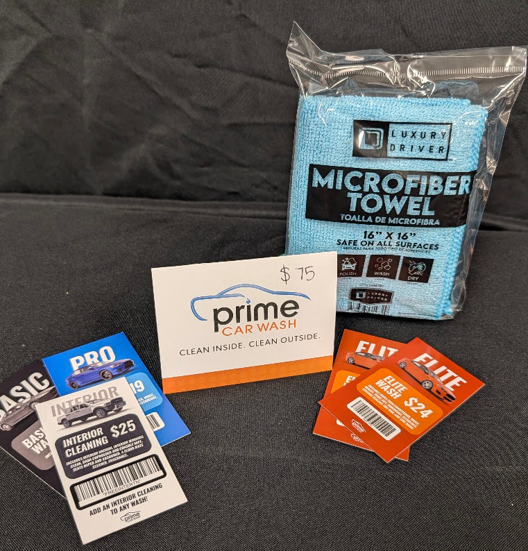 Prime Car Wash Package includes: $75 Gift card, microfiber towel, upgrade certificates, & Elite wash certificates! Worth over $180!
