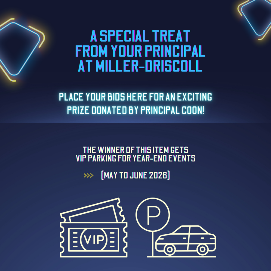 Score the ultimate parent perk! Enjoy a Prime Reserved VIP Parking Spot at Miller-Driscoll for end-of-eear events—(Celebration of Learning and Field Day)! No more circling the lot or showing up way too early to snag a space. With this coveted spot, you can arrive right on time, step out stress-free, and head straight to the fun.