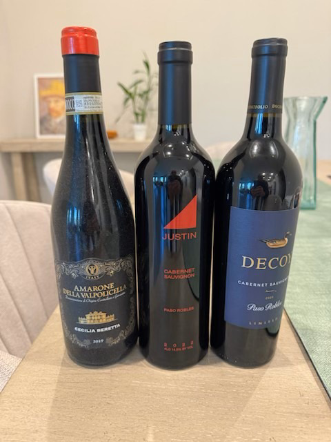 • 3 Bottles of Wine: Amarone Della Valpolicella, Justin Cabernet Sauvignon, Decoy Cabernet Sauvignon