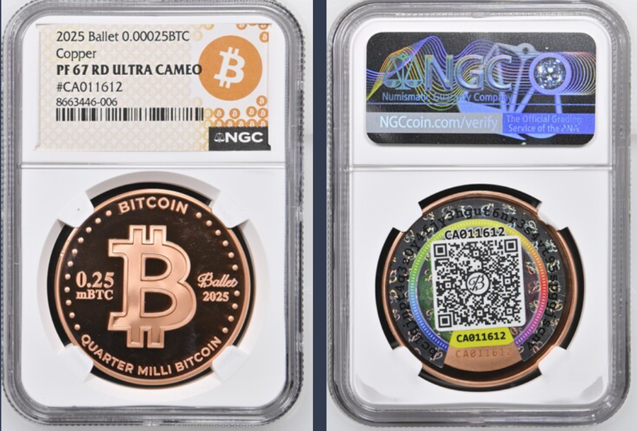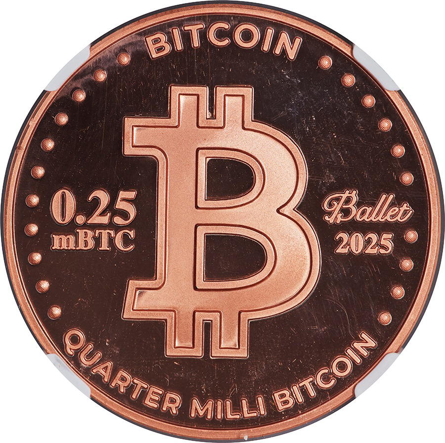 Ballet Crypto Wallet copper Loaded (Unredeemed) Proof "Quarter Milli" 0.00025 Bitcoin (BTC) 2025 PR67 Red Ultra Cameo NGC, Ahonen-Unl. 39mm. Serial #CA011612. Public address: bc1qjnpt4q3z0y4fjy3hgut6nr3s4vt95spggjscnv. A Quarter Milli Bitcoin Proof issue from the growing Cryptocurrency market, grading here at a PR67 Red Ultra Cameo. These flashy amber pieces display the iconic Bitcoin “B”, while the reverse bears a polychromatic ring that draws attention to the Bitcoins serial number and public address.