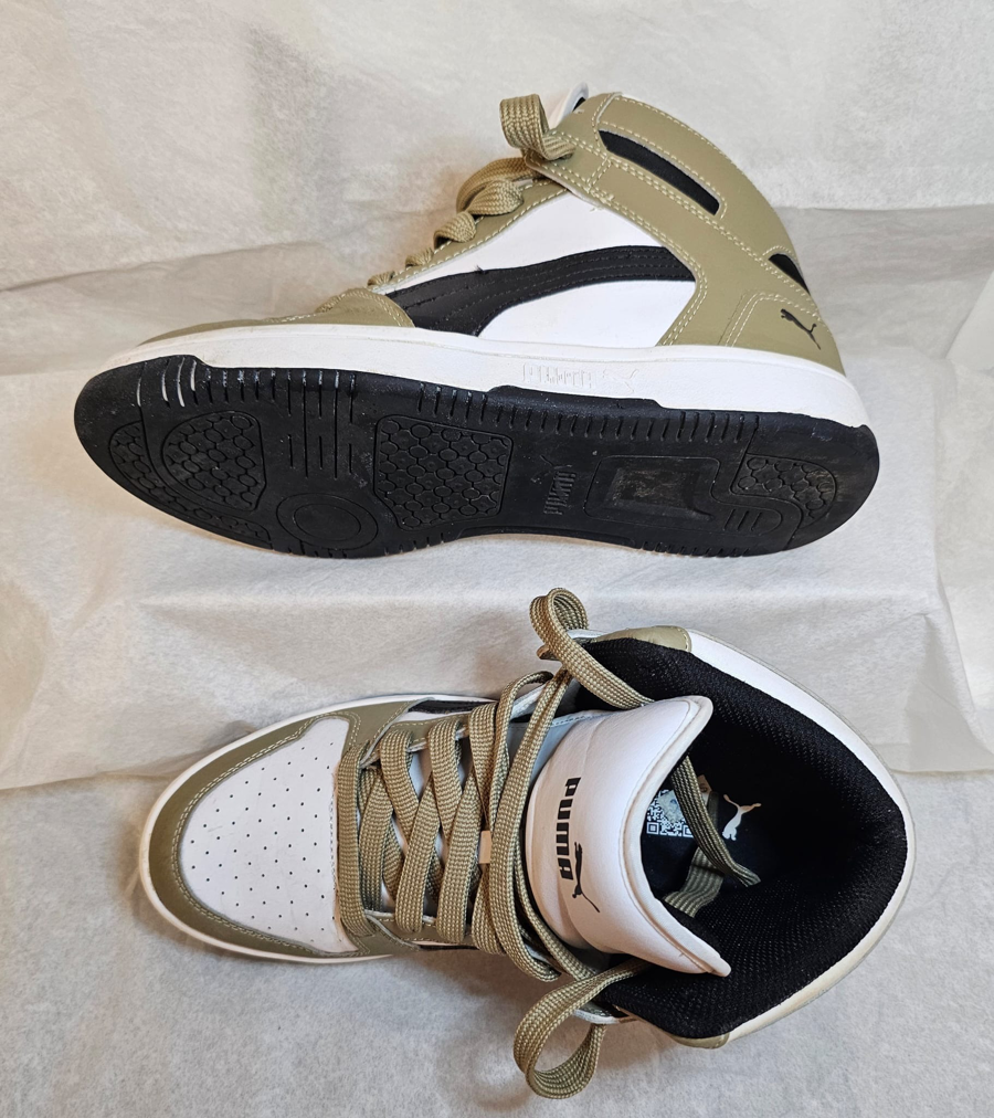 Here is a trendy look for flying kites at Easter. These are Puma Rebound Layup SL high-top sneakers. Inspired by classic 1980s basketball styles, these street-ready shoes feature a mid-top silhouette and the iconic Puma Formstrip along the sides. They are designed for comfort and fashion.