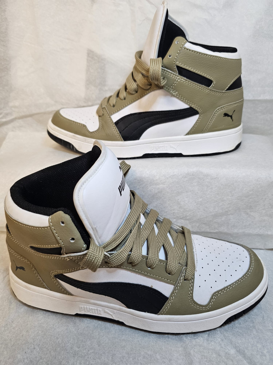 Here is a trendy look for flying kites at Easter. These are Puma Rebound Layup SL high-top sneakers. Inspired by classic 1980s basketball styles, these street-ready shoes feature a mid-top silhouette and the iconic Puma Formstrip along the sides. They are designed for comfort and fashion.