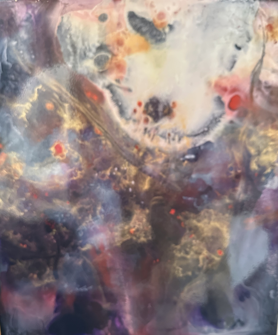 Introducing "Purple In Bloom," a stunning piece of reversed painted glass created by the talented local artist Leigh Blackistone. This exquisite artwork features elegant purples that beautifully capture the essence of blooming colors. Measuring 15 x 17 inches, it is a perfect addition to any space, adding a touch of sophistication and artistry.