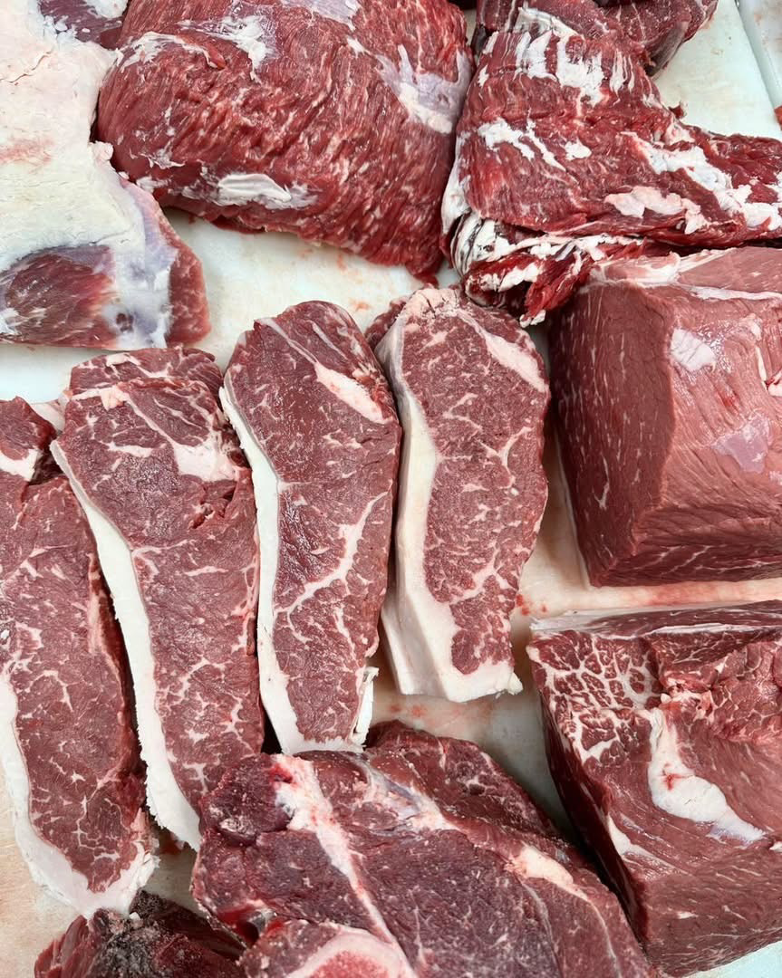 Ground beef, filet mignon (beef filet), short ribs, half brisket, arm, chuck, and sirloin tip roasts, ribeye, KC strips, sirloin, flank steaks, round steaks, stew meat, and soup bones.