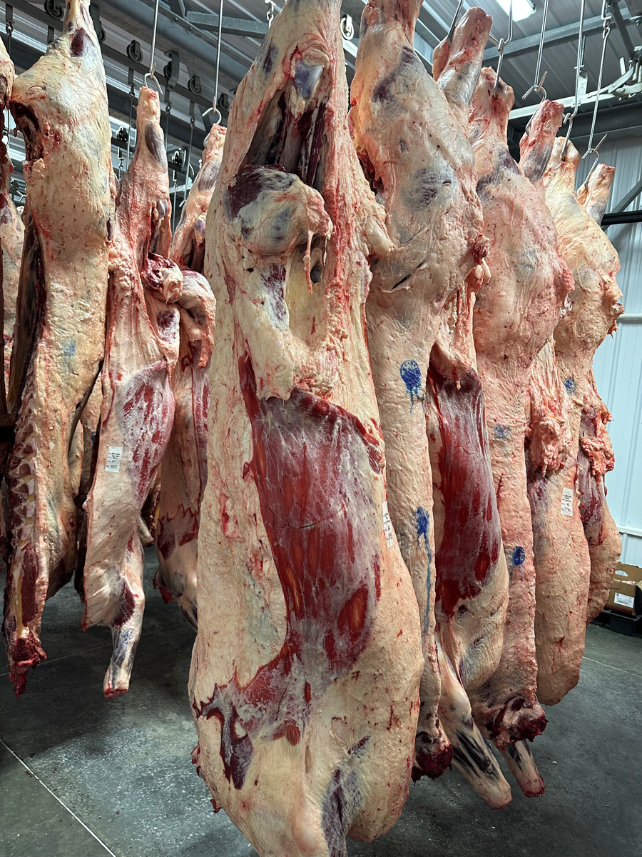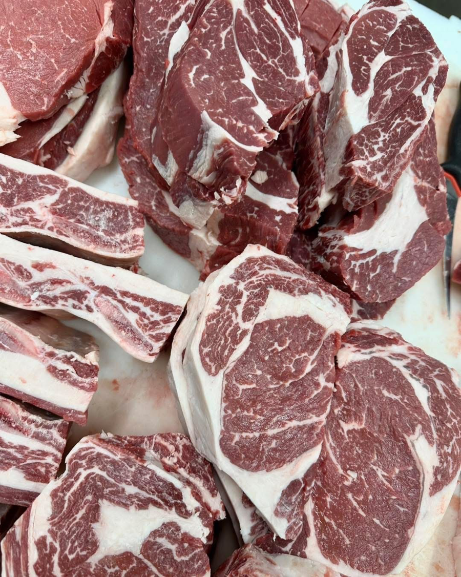 Ground beef, filet mignon (beef filet), short ribs, half brisket, arm, chuck, and sirloin tip roasts, ribeye, KC strips, sirloin, flank steaks, round steaks, stew meat, and soup bones.