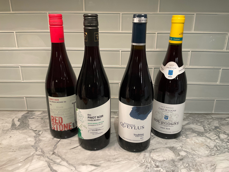 4 red wines.(750 ml each) Domaine Queylus, VQA Niagara Peninsula (Pinot Noir), Cave de Lugny, Bourgogne (Pinot Noir), Red Stone Lincoln Lakeshore VQA (Gamay Noir) and Chateau des Charmes,Cuvee Michele Nigara on the Lake VQA (Pinot Noir)