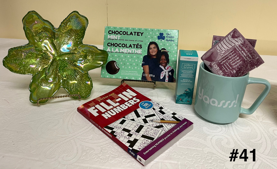 Take pleasure in a quiet moment with these items. This pack includes a box Girl Guide Chocolate Mint cookies, green glass dish, mug, tea, retinol repair, and a puzzle book.