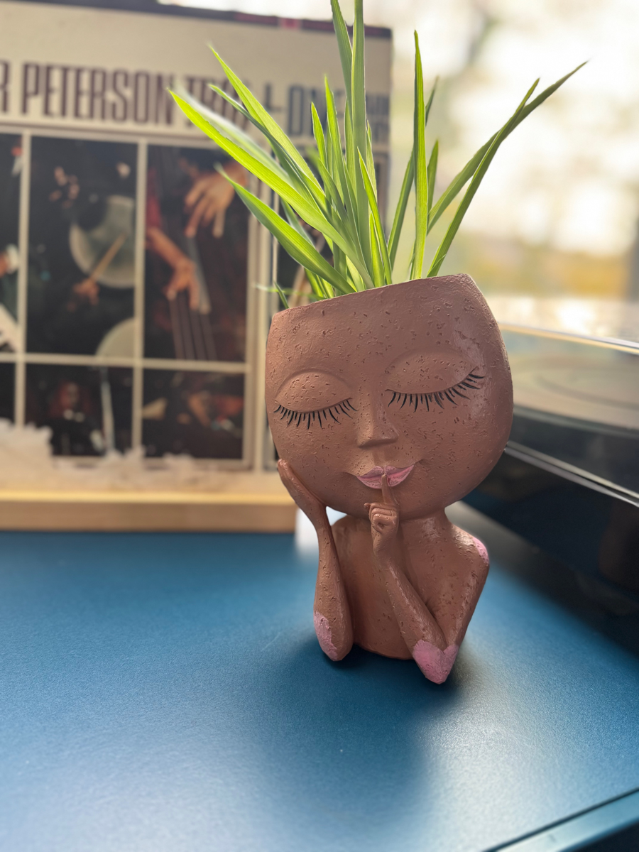 Up for auction is this artistic and peaceful "Quite Please" planter. This unique pot features a girl face with closed eyes and a "shushing" expression. The live plant grows out of the top like hair as she sweetly gestures "Quite Please". • The Planter: Textured, terracotta-like finish with hand painted details (lashes, lips, etc...) • The Plant: Features a tall healthy, live non-variegated Spider Plant. These are low-maintenance and great for air purification. • Size: Small size (7” x 5”) perfect for desks, bathrooms or anywhere you need a little peace and quiet. She is a perfect companion for your library or home office. Don't miss out on this unique piece created by a Lacamas Lake Elementary parent.