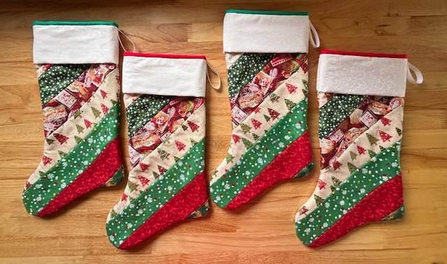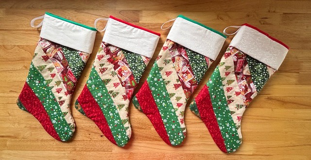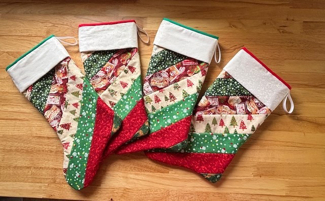 Add a touch of handmade charm to your holiday décor! This set of four quilted Christmas stockings is beautifully crafted, fully lined, and finished with ribbons for easy hanging. Perfect for filling with festive treats and brightening your home for the holiday season. The quilted Christmas stockings measure approximately 8-1/2″ wide at the toe, 7″ wide at the top of the cuff, and 13-1/2″ long.