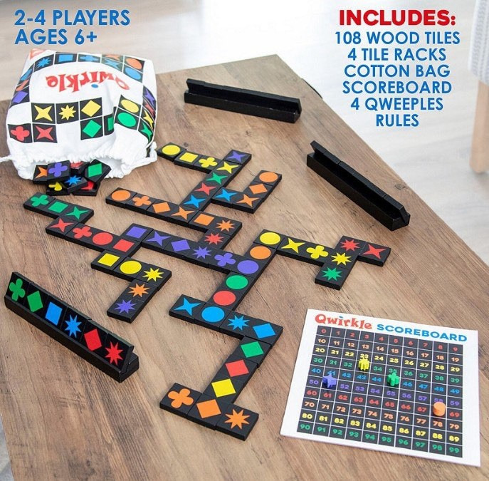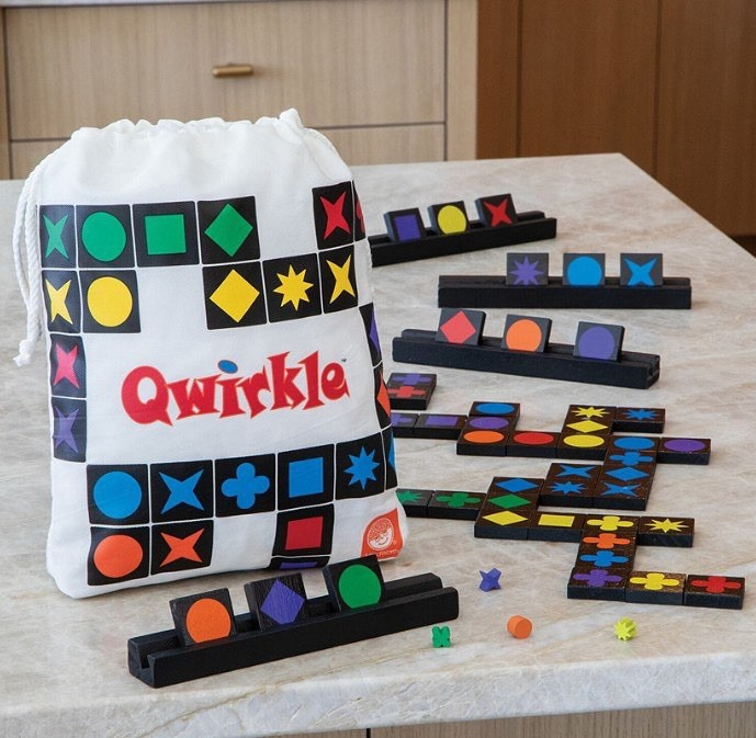 MindWare's best seller is a simple game of matching colors and shapes: a must-have for your next family game night! Players score points by building rows and columns of brightly-colored tiles that are either all the same color or all the same shape, without creating duplicates; create a line of all six in a row, and you score a "Qwirkle." It’s the perfect combination of skill and chance that all ages can play, understand and enjoy! A unique score board, Qwirkle-shaped score markers, wood tile racks and deluxe bag make our exclusive version more fun than ever! • Includes 108 wooden tiles, exclusive scoreboard and 4 Qwirkle-shaped scoremarkers, 4 wooden tile racks and drawstring bag • A game that’s easy for beginners but challenging enough for the most competitive teens and adults • Teaches young players colors, shapes, math, early strategy and problem-solving skills • Sharpens older players’ strategic thinking; a great game to stretch and train your brain! • For 2 to 4 players • Over 7 million copies sold worldwide • Other favorite products include: Qwirkle Rummy, Qwirkle Cubes and Travel Qwirkle Age Recommendation: Ages 6 and up