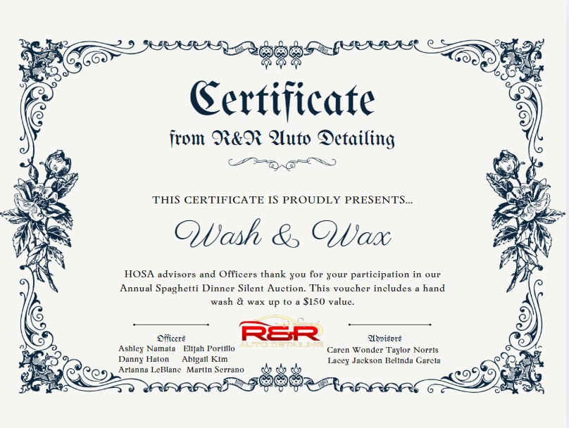 Gift certificate for a hand wash & wax on any vehicle