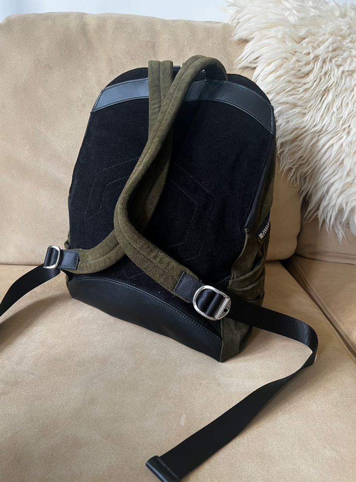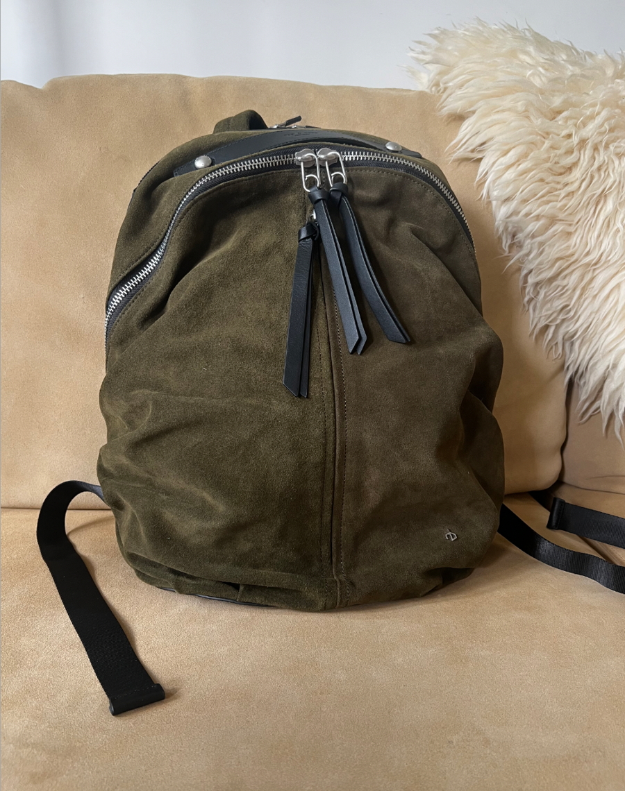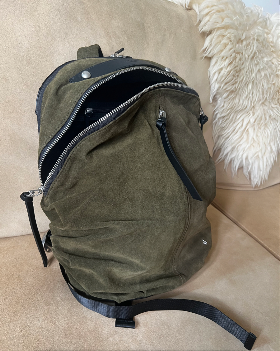 rag & bone backpack crafted from Italian suede with leather trims, with a front zip for easy access. Lined in soft corduroy, with a handy key attachment, a secure laptop compartment, and padded back panel.