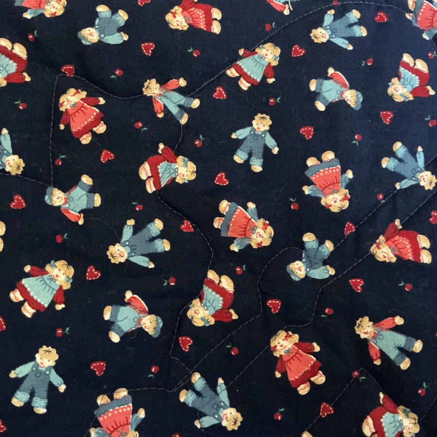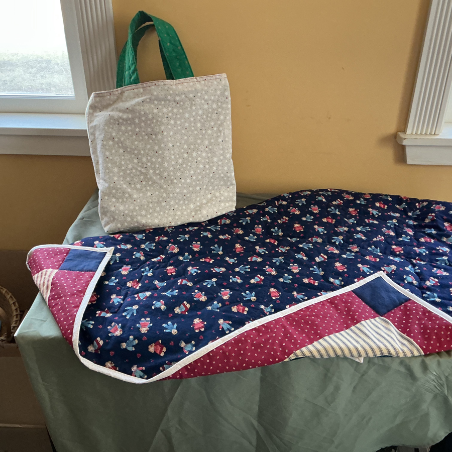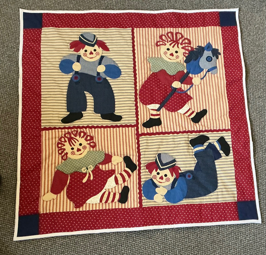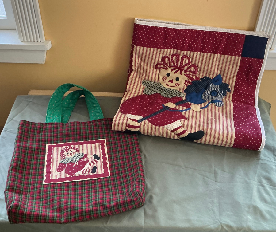 Raggety Ann and Andy themed reversible tote, Raggety Andy doll with puppy, and reversible square quilt, 33 1/2 by 33 1/2 inches.