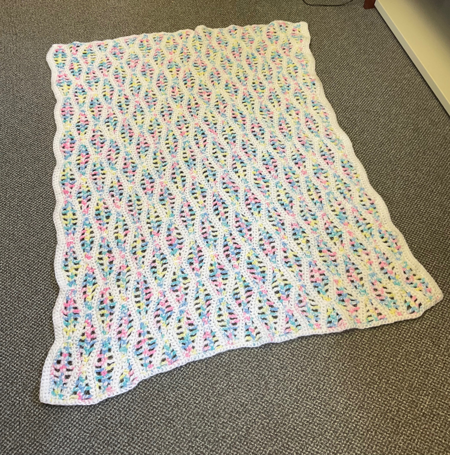 A brand new baby blanket with a mix of white and several pastel colors. 45 x 35.5 inches.
