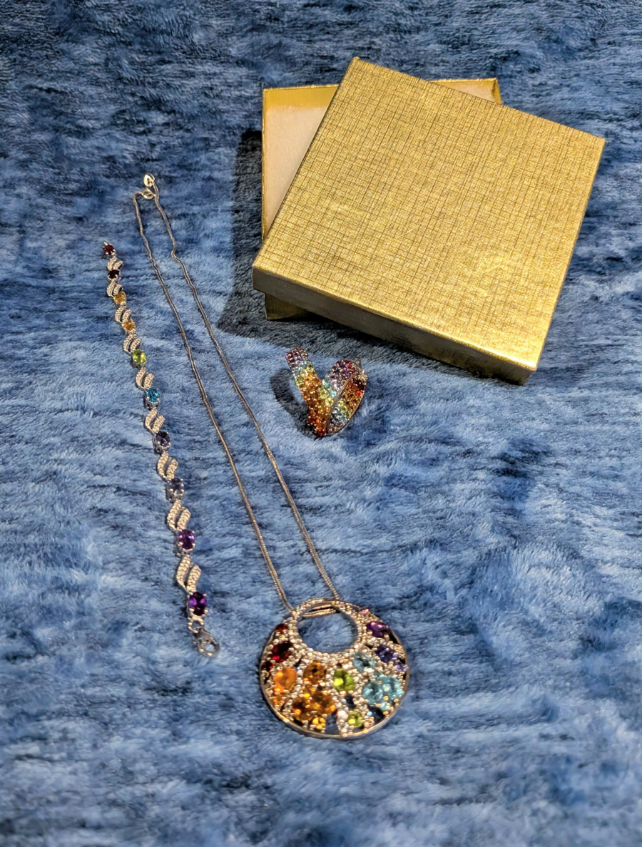 Auction Items: Rainbow Sterling Silver Jewelry Set (Necklace, bracelet and earrings) Comes in gold box