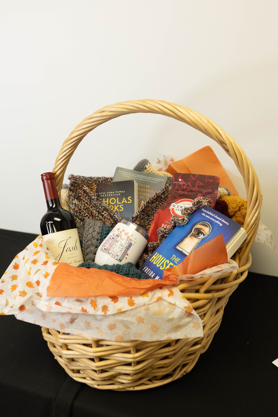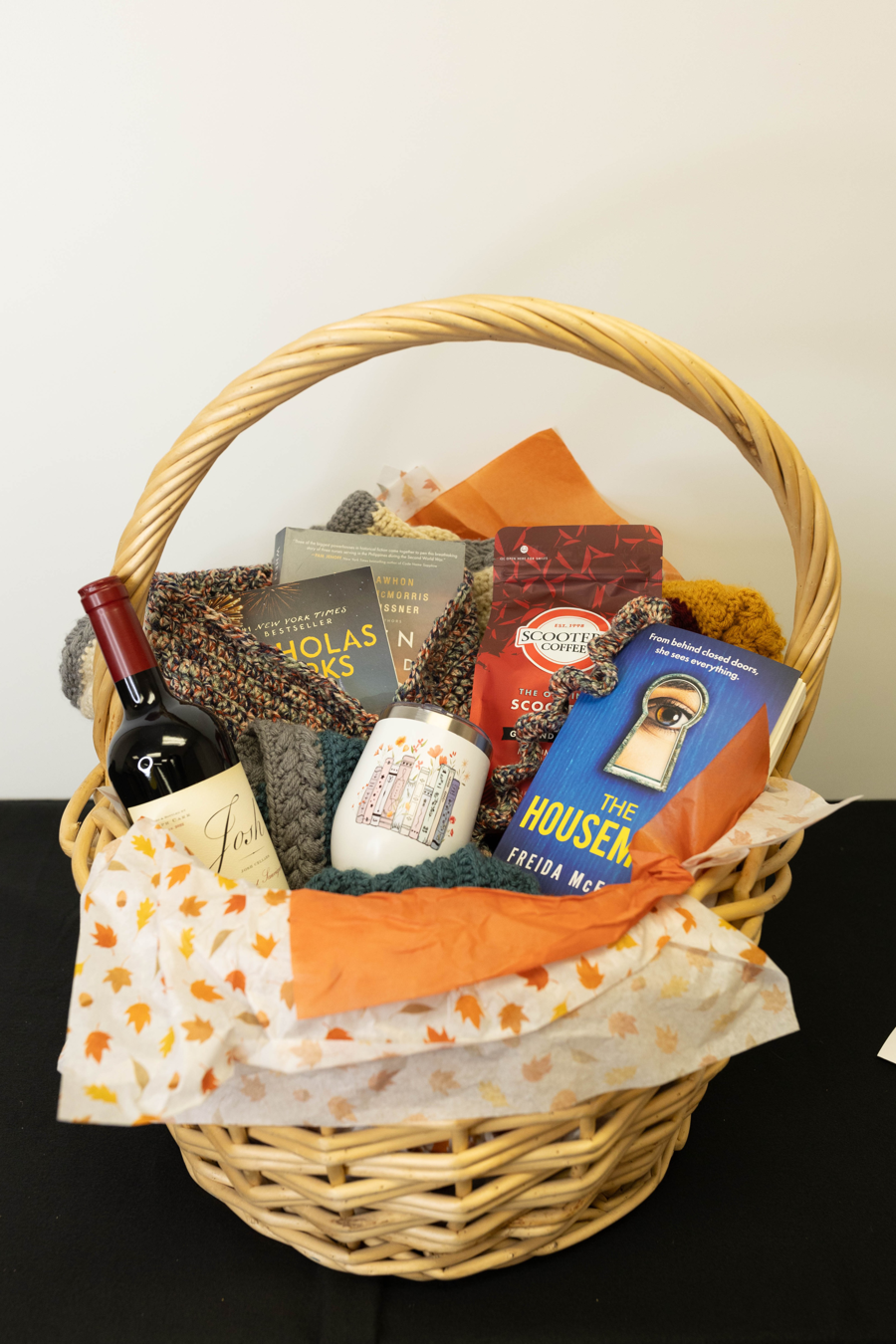 Relax and unwind with this comforting collection of handmade and gourmet goodies. Includes: • Comfort: Large handmade crochet blanket • Books: 3 best-seller titles • Beverages: Bag of Scooters coffee, Josh Cabernet Sauvignon wine, tumbler A perfect package for cozy evenings, reading, and savoring favorite drinks.