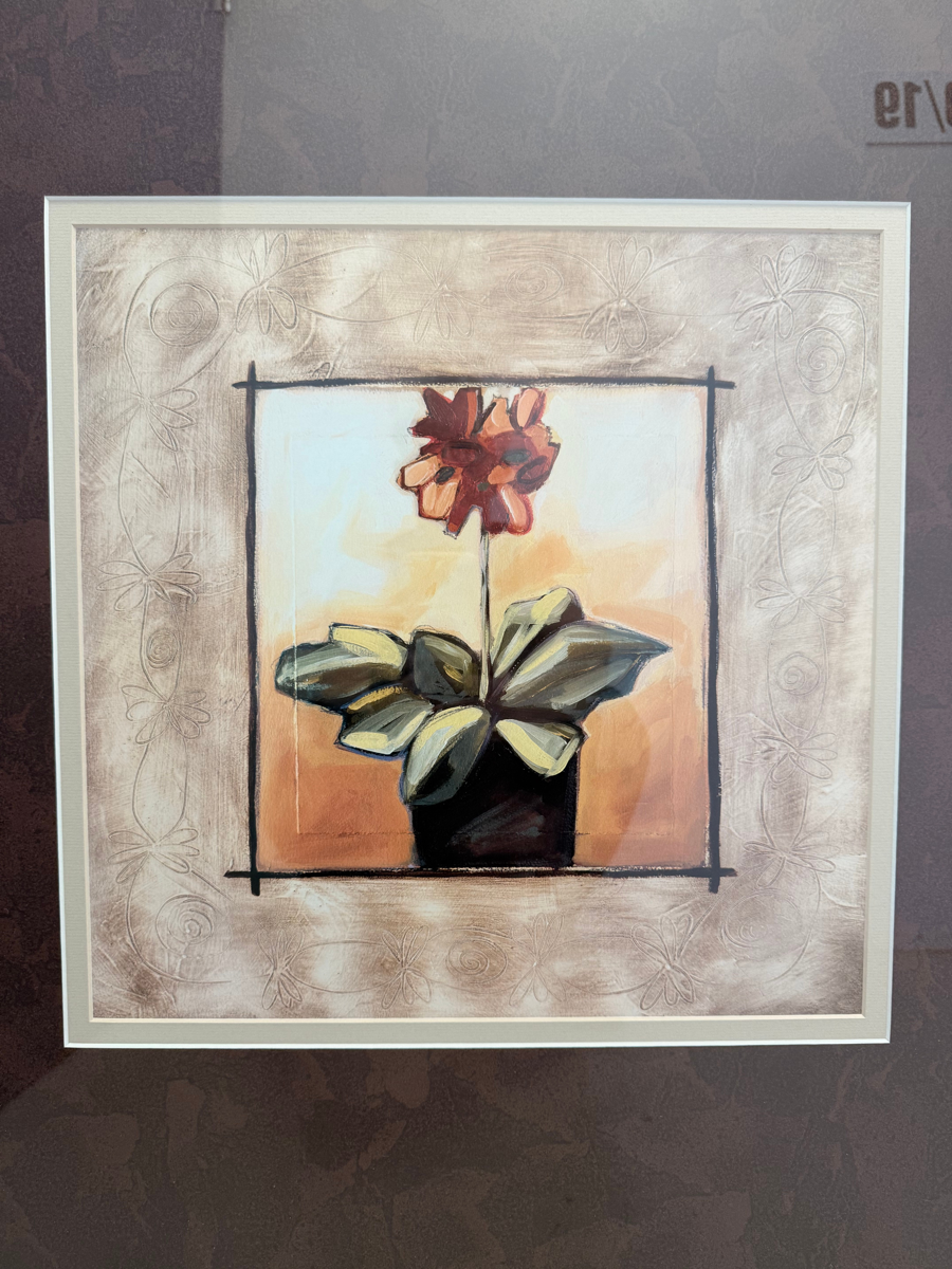 The artwork is a print titled Red Geraniums by the artist Maria Eva. It is a popular, mass-produced floral print. The artwork features a potted plant with large green leaves and reddish-orange flowers in a black pot. The central image has an inner decorative border and is set against a large brown and beige mat with an ornate gold-toned frame. The frame has lovely detailing and can be repurposed for other art, a mirror, or blackboard. Photos do not give piece the justice it deserves. Come visit the store and view in person during the auction period.