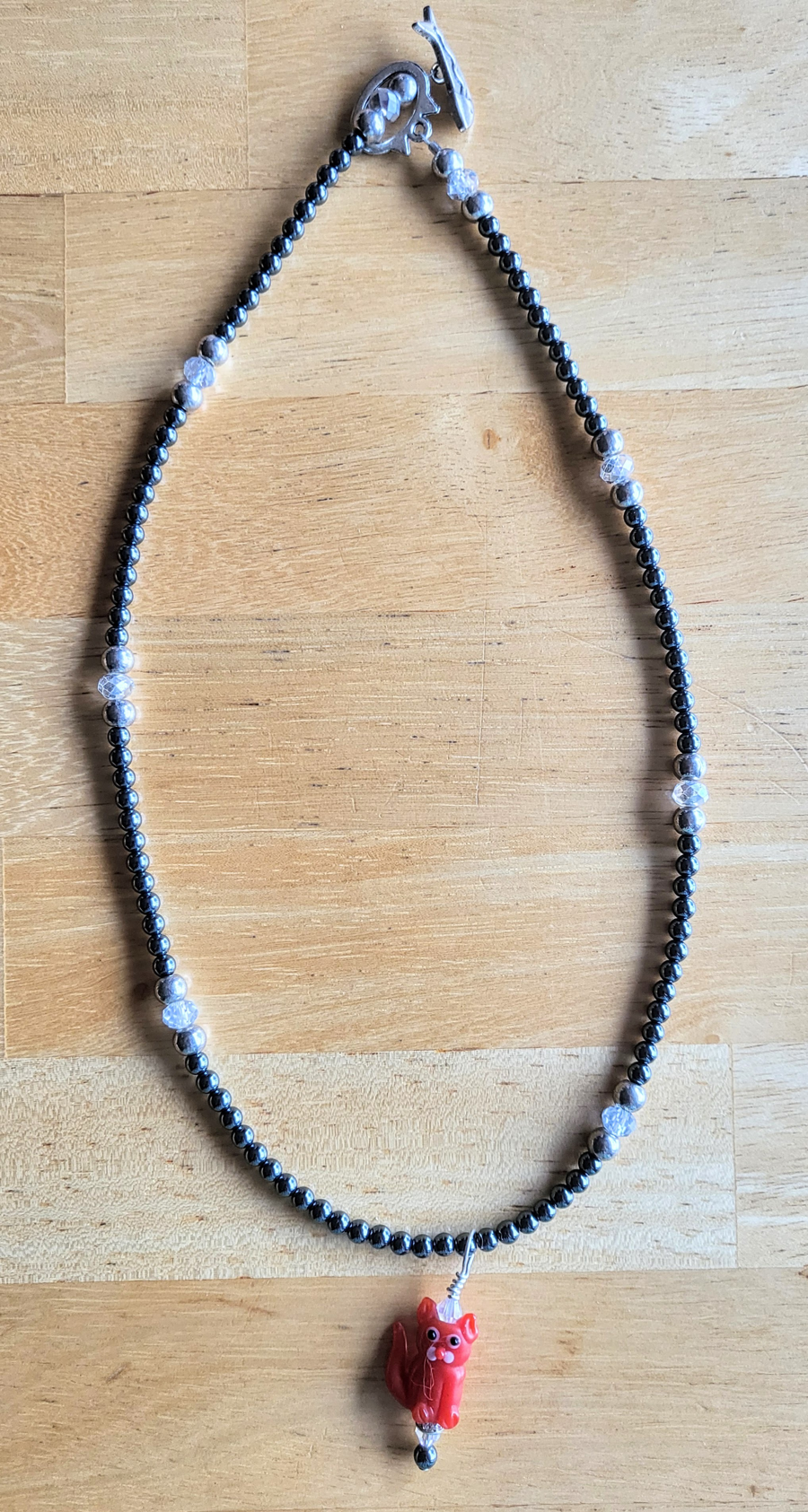 Sweet red glass kitty with crystals and sparkly accent on hematite and glass bead necklace, with fun cat and fish closure! One of a kind, handmade necklace measures about 21" in length.