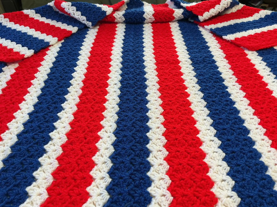 Handmade crocheted red, white, and blue afghan. 49 x 42 inches.