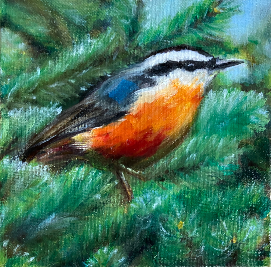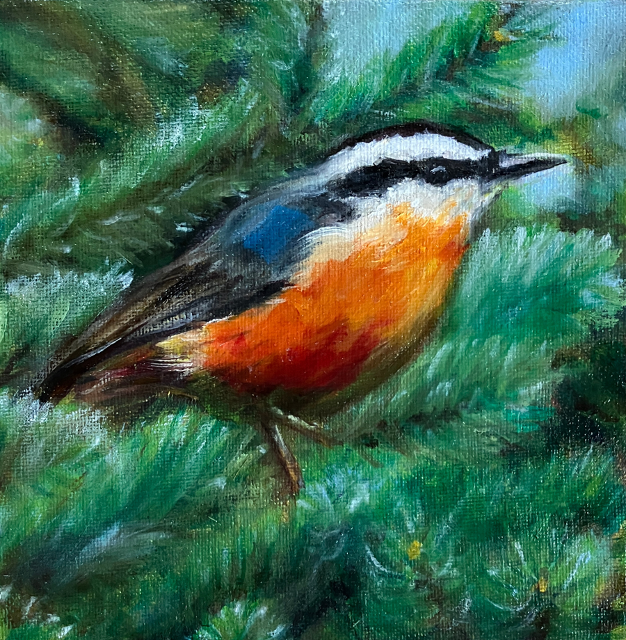 Artist statement: These energetic little denizens of the boreal woods are a delightful early winter visitor to our southern Minnesota yard!