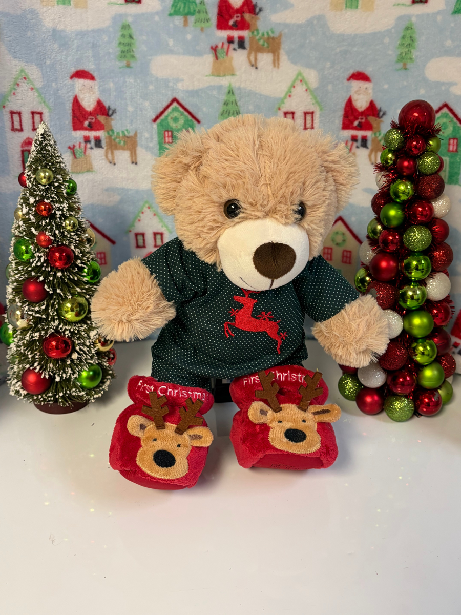 Reindeer Rally Remy is a joyfully handcrafted Christmas companion dressed in a cozy green polka-dot top featuring a leaping red reindeer, paired with the most adorable “First Christmas” reindeer booties. With his soft tan fur, bright eyes, and cheerful holiday spirit, Remy brings the magic of the North Pole and the warmth of Christmas cuddles wherever he goes. He proudly carries his How to Count book, ready to help his new friend explore numbers with confidence, curiosity, and festive fun. Whether he’s sitting snugly beneath the Christmas tree, joining pretend sleigh-ride adventures, or offering comforting hugs on winter nights, Reindeer Rally Remy fills every home with holiday cheer, sweetness, and heart. Handmade with love, merry from head to toe — Remy can’t wait to meet his forever friend.