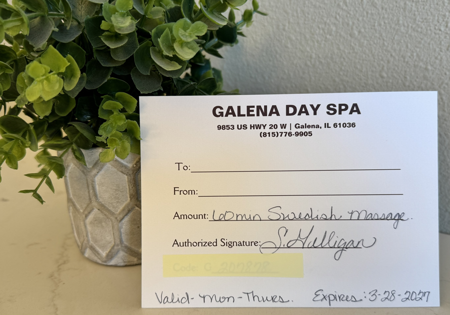 This auction includes a gift card for (1) 60-minute Swedish Massage at Galena Day Spa located at 9853 US HWY 20 Galena, IL