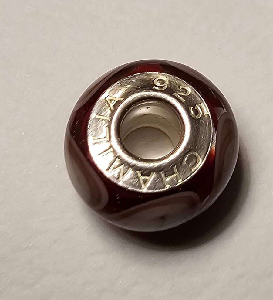 Own a piece of charm bracelet history with this beautiful retired Chamilia Murano glass charm. This charm features a rich brown and white swirling glass design that adds a touch of warm elegance to any bracelet. Made of genuine Murano glass and high quality 925 sterling silver. Designed with a universal core, it fits all major bead bracelet systems, including Pandora, allowing for seamless integration into your existing collection. Note: it is not Pandora however it does fit the Pandora bracelet systems and is sterling silver.