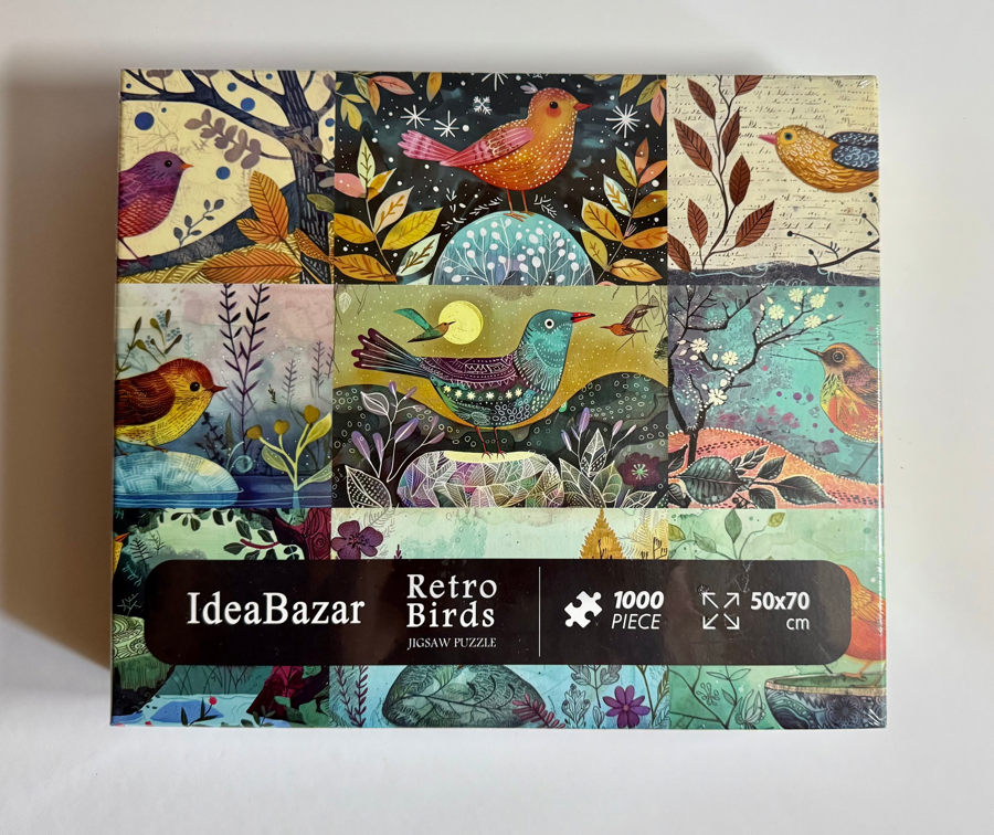 A colorful collage of birds in nature. 1000 pieces.