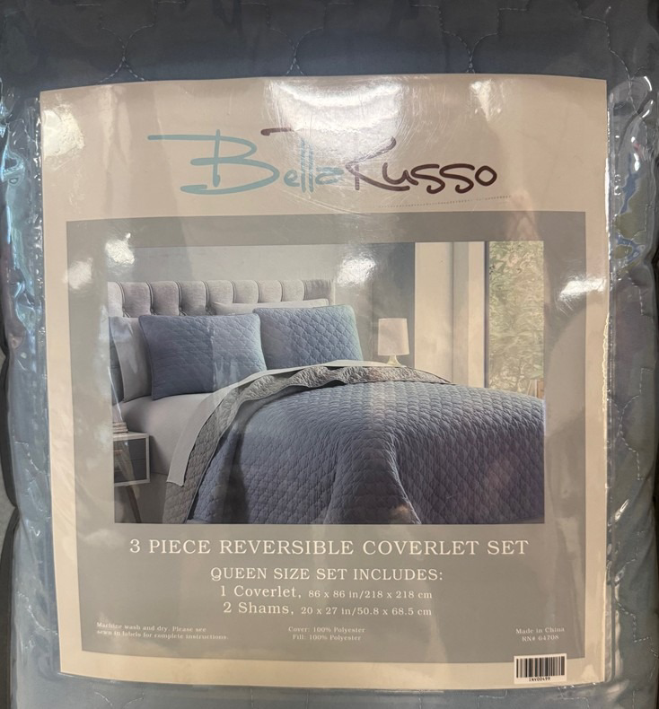 Three Piece Reversible Queen Coverlet Set includes one coverlet (blue/gray) and two shams