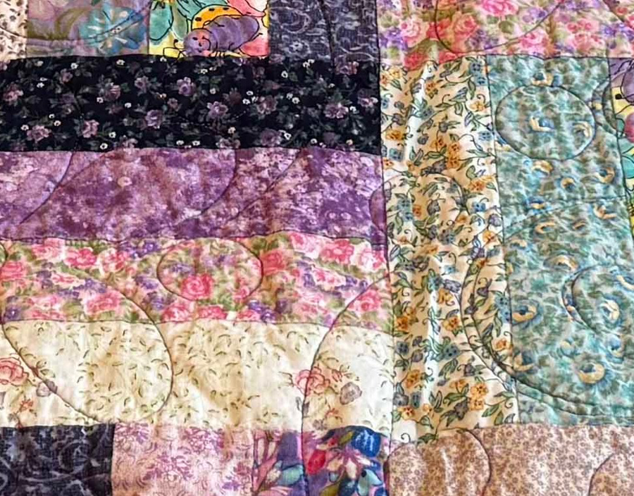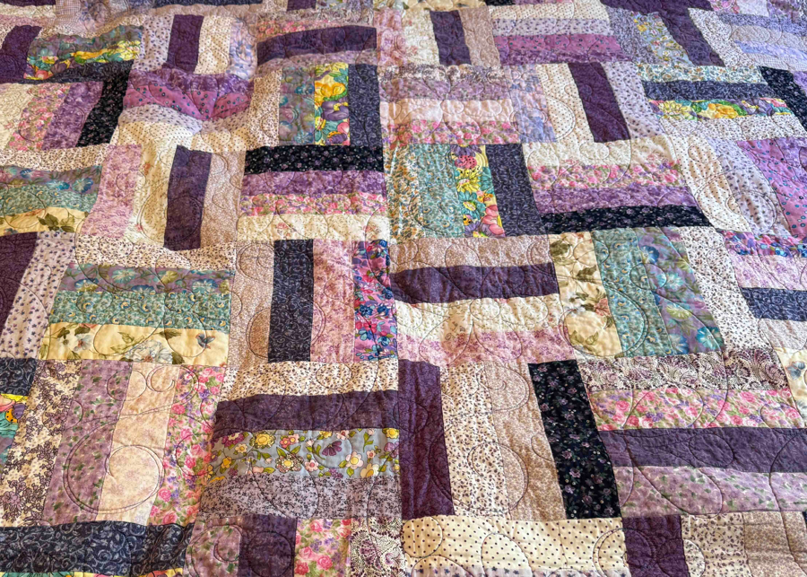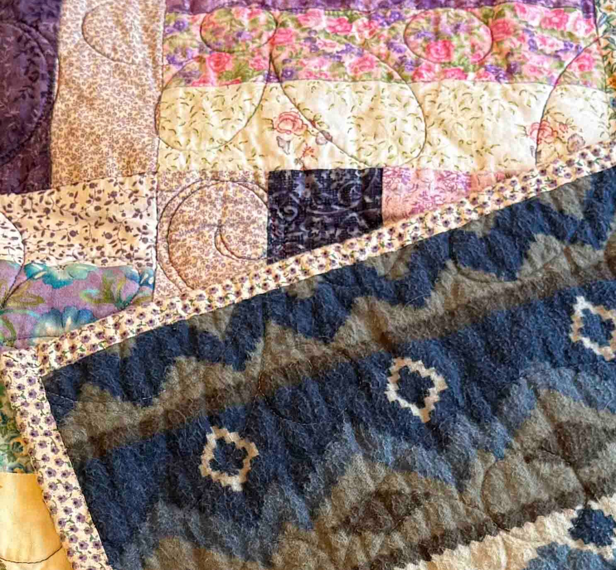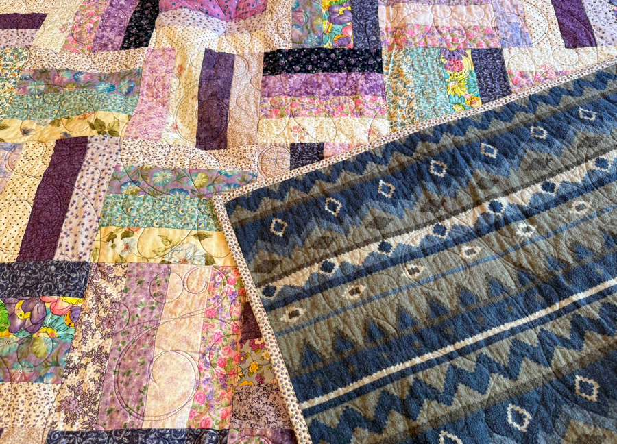 You won't find another one as beautiful as this! What a unique wedding or Christmas gift this quilt would make! This hand-sewn quilt was lovingly crafted by one of our volunteers' grandmothers. Created from narrow strips of fabric in beautiful shades and patterns of purples, greens, yellows and pinks. Reversible - a warm fleece, southwestern pattern in blue/brown tones. Stitched throughout with flower swirling patterns. Carefully edged - it will outlast us all! Never used, safely stored, and only spread out on a queen-sized bed for these photos.