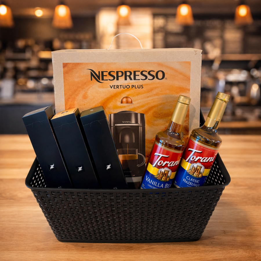 Nespresso Vertuo Plus Machine: $199, Nespresso Capsules- 30 count: $42, 2-750ML Syrups (Classic Hazelnut, Vanilla Bean)- $25