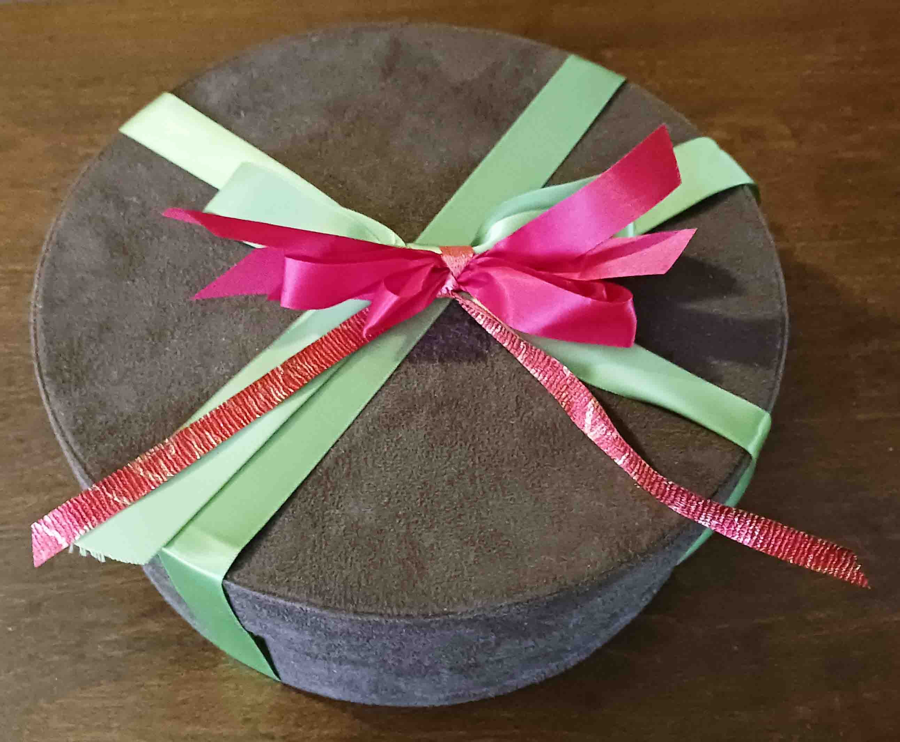 Give a gift with style! This 9" diameter x 3" high gift box is ready to be filled with something special. Or use it to store something precious. Nice brown suede texture.